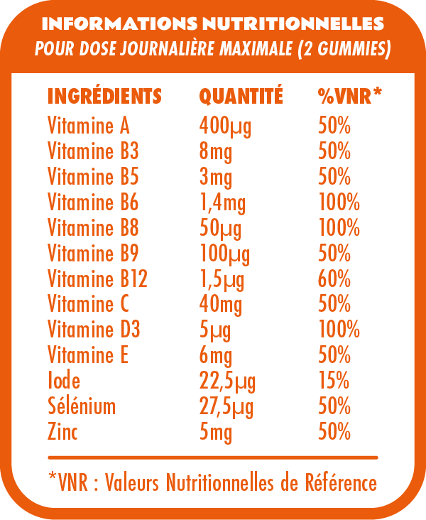 AGENT DE CHARGE : MALTITOL; GĂLIFIANT : PECTINE; ACIDIFIANT : ACIDE CITRIQUE; ACIDE L-ASCORBIQUE (VITAMINE C), ARĂME NATUREL, ACĂTATE DE DL-ALPHA-TOCOPHĂRYLE (VITAMINE E), ACIDIFIANT : CITRATES DE SODIUM; CITRATE DE ZINC, NICOTINAMIDE (VITAMINE B3), CONCENTRĂ DE RADIS ET CARTHAME, SĂLĂNITE DE SODIUM (SĂLĂNIUM), ACĂTATE DE RĂTINYLE (VITAMINE A), AGENT DâENROBAGE : CIRE DE CARNAUBA; D-PANTOTHĂNATE DE CALCIUM (VITAMINE B5), IODURE DE POTASSIUM, CHOLĂCALCIFĂROL VĂGĂTAL (VITAMINE D3), CHLORHYDRATE DE PYRIDOXINE (VITAMINE B6), CYANOCOBALAMINE (VITAMINE B12), ACIDE PTĂROYLMONOGLUTAMIQUE (VITAMINE B9), D-BIOTINE (VITAMINE B8).