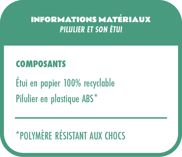 Comme pour tous nos packagings, nous avons fait le choix d'un étui 100% recyclable. Notre Pilulier est fabriqué à partir d'ABS, un polymère thermoplastique, résistant et léger pour protéger vos super compléments où que vous alliez.
